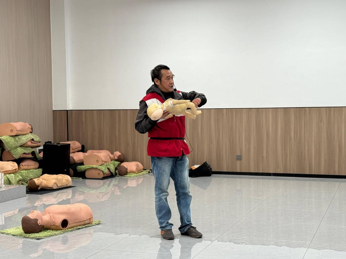 培训从真实案例切入,深入浅出地讲解了“黄金4分钟”救援原则,并系统演示了心肺复苏、AED使用、气道异物梗阻急救及常见创伤包扎等核心技能。讲师通过分步示范,精准拆解操作要领,确保学生扎实掌握规范流程。