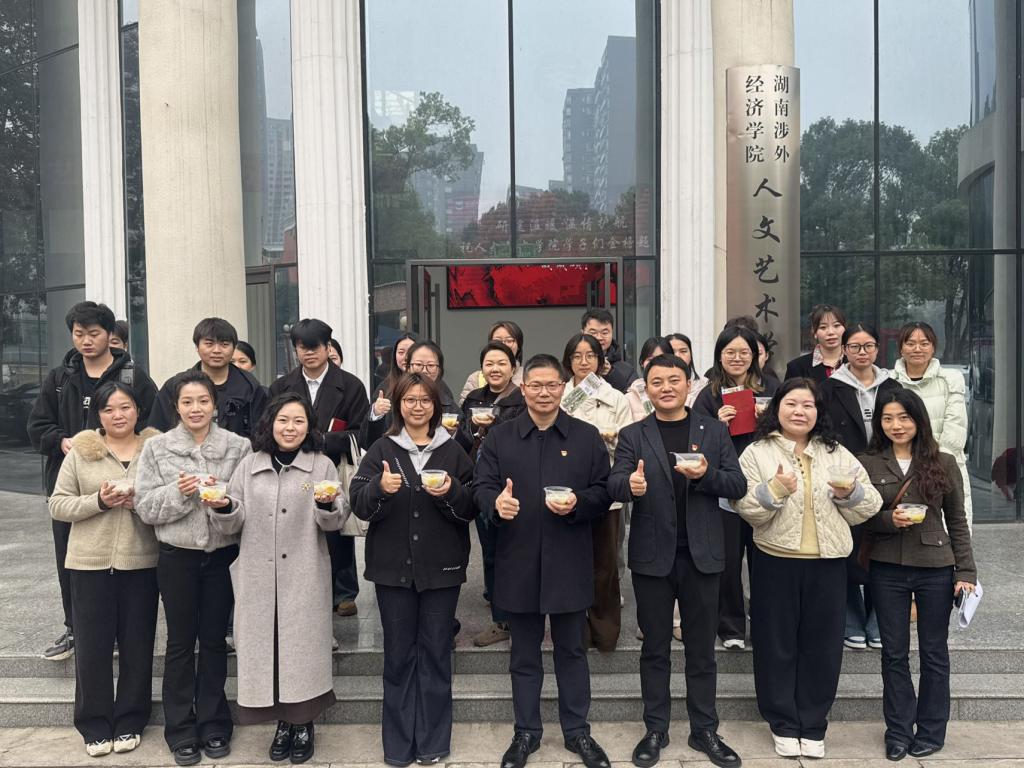 题字祝福环节成为活动的暖心亮点,人文艺术学院教师在文创收纳袋上郑重写下“一战成硕”、“金榜题名”、“前程似锦”等真挚寄语,笔墨间凝聚着对学子的深切厚望。人文艺术学院院长李向明、党总支书记马尚奇亲手将写满祝福的收纳袋递至学子手中,鼓励大家以坚定信念冲刺终点、以从容心态迎战考场。与此同时,老师们在长桌旁细心分装热汤圆,不仅驱散了冬日的严寒,更传递着学院的温暖关怀,让学子们在紧张备考中感受到满满的归属感与幸福感。