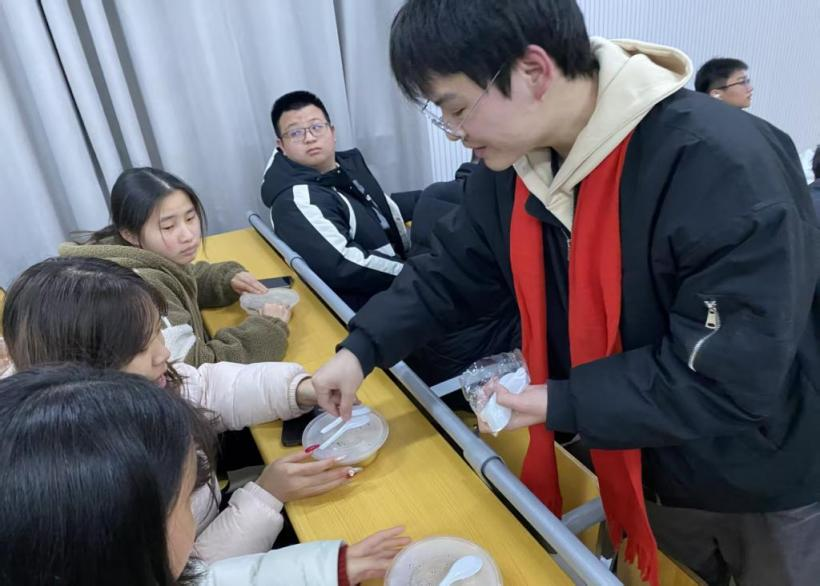 活动现场喜庆祥和、暖意融融。学院党总支书记杨建波、团总支书记邱涛及大一辅导员代表来到活动现场,与同学们亲切交流,为大家送上热气腾腾的元宵,并参与灯谜竞猜活动,共话佳节。在师生互动中,节日氛围愈发浓厚,欢声笑语此起彼伏。围绕传统文化元素设计灯谜内容,涵盖历史典故、诗词文化、节日习俗等多个方面,吸引大一年级同学广泛参与。活动过程中,同学们踊跃竞猜、积极互动,在沉浸式体验中感受传统文化的独特魅力,增进班级凝聚力与同窗情谊。