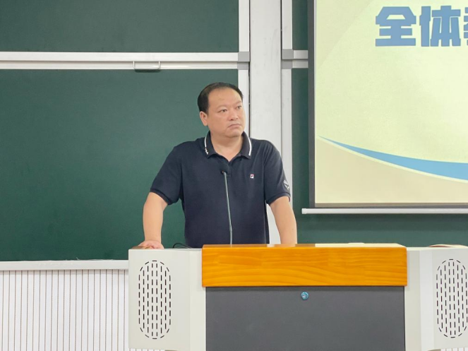 体育学院院长谢明首先向全体教职工表示亲切问侯,表达新学期祝愿。接下来,他对假期各项工作取得显著成效进行回顾与总结;对期间不畏艰辛、忘我奉献、积极投身于学院各项工作的先进个人予以表扬;对招生情况进行通报;对2022年度新聘教师表示热烈欢迎并逐一介绍;对第十七届田径运动会、湖南省大学生运动会、学校艺术节、学生宿舍管理提出工作要求。最后,他作动员讲话,以社会热点事件为切入点,向全体教职工抛出“我们要做什么样的人?”“我们要培养什么样的人?”两个问题,指出体育学院办学价值观“以忠恕之道立德,以父母之心育人”蕴涵的育人理念。同时,他对“团队意识”进行解读,向与会教师如何成为有信仰、有追求的好老师、好职工提出殷殷期望和希冀。