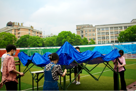 在学校南北门,体育学院的志愿者们穿着红色马甲,面对长沙多变的天气,顶着炎炎酷暑或者疾风骤雨仍坚守在岗位,做到所有出入人员一律要出示健康码、完美校园app并测量体温。在学院核酸检测时,楼栋各层、核酸路径卡口、田径场都有他们的身影,志愿者队伍有组织、有纪律,有担当,为广大学生安全有序的核酸检测筑起守护之墙,彰显了党团学生干部的责任与担当。