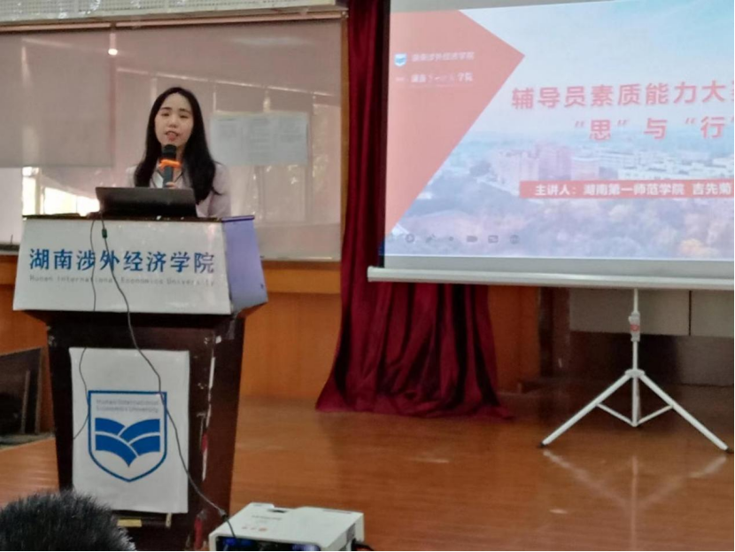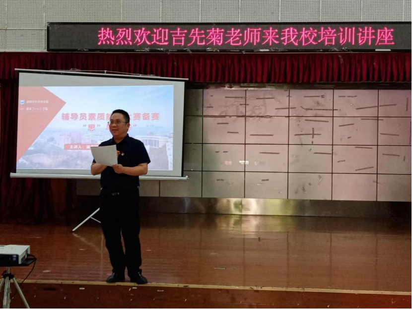 为进一步加强伟德官网辅导员队伍建设,提高辅导员队伍专业化、职业化、专业化水平,更好地迎接湖南省第九届辅导员素质能力大赛,5月5日,学生工作处邀请了湖南省第八届高校辅导员素质能力大赛(本科院校组)复赛一等奖获得者——湖南第一师范学院数学与统计学院专业辅导员兼团委书记吉先菊,来伟德官网为辅导员开展一场题为“辅导员素质能力大赛备赛‘思’与‘行’”的讲座,学生工作处处长邝继红、各二级学院党总支书记以及全体辅导员参加了培训,讲座由副校长鞠晨曦主持。