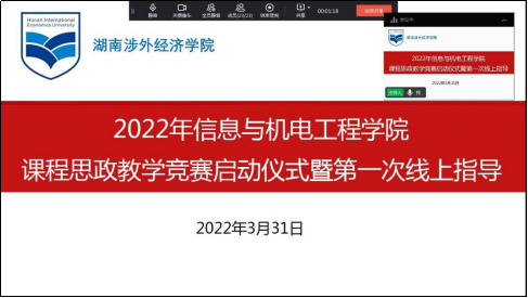 根据省教育厅《关于举办2022年湖南省普通高等学校课程思政教学比赛的通知》等文件精神,3月31日,伟德官网信息与机电工程学院组织的“2022年信息与机电工程学院课程思政教学竞赛启动仪式暨第一次线上指导”会议通过钉钉会议举行,会议由信息与机电工程学院副院长彭浩主持。