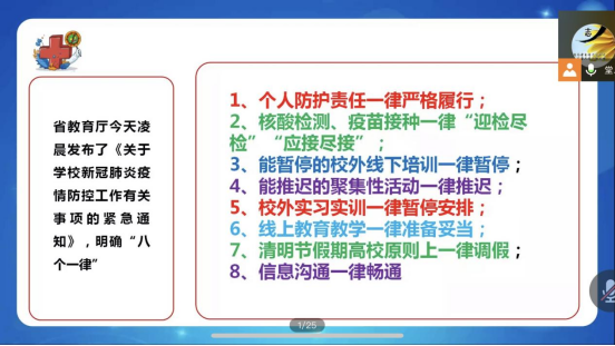 会上,唐志文认真传达了3月27日全省教育系统新冠病毒肺炎疫情防控工作紧急会议精神、学校疫情防控工作紧急会议的精神,并组织学习了省教育厅最新下发的《关于学校新冠肺炎疫情防控工作有关事项的紧急通知》,要求全体人员认真执行“八个一律”,确保个人防护、核酸检测、疫苗接种、聚集性活动、校外实习实训、线上教育教学、清明节假期、信息沟通等相关工作落实见效。