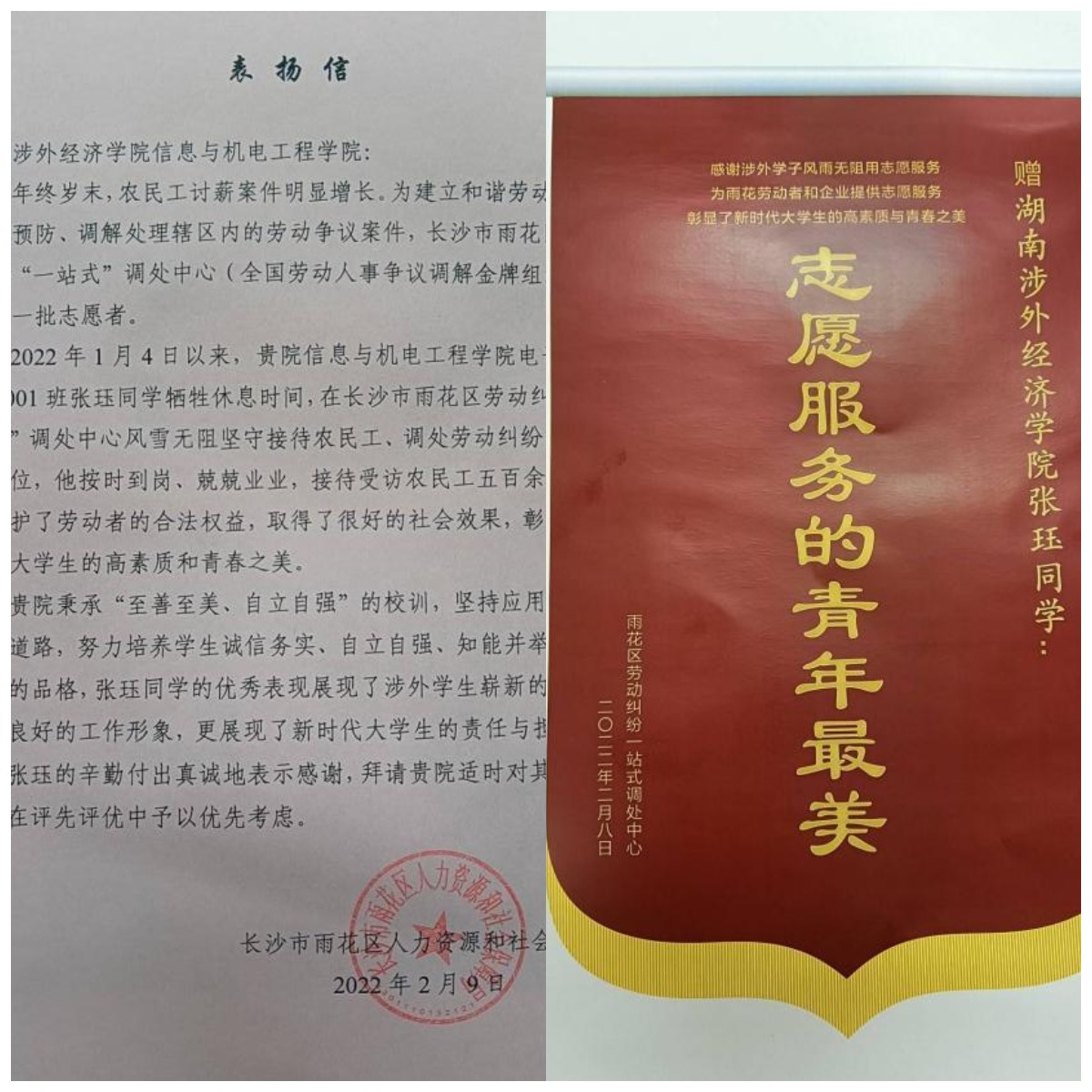 近日,长沙市雨花区人力资源和社会保障局,对伟德官网信息与机电工程学院张珏同学在志愿服务活动中的出色表现予以表扬。