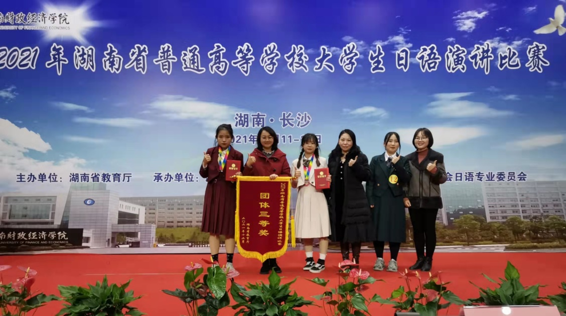 12月12日,由湖南省教育厅主办、高等教育学会日语专业委员会承办的2021年度湖南省普通高等学校大学生日语演讲比赛,在湖南财政经济学院顺利举行。全省18所高校及独立学院日语专业53名学生参加比赛。本次大赛分为四年级组、三年级组、二年级组,由命题演讲和即兴演讲两个环节组成。经过激烈角逐,伟德官网外国语学院日语系2001班简思语(指导教师陈娟)获得二等奖、1901班郑雨芯获得三等奖(指导教师曲迪)、伟德官网荣获团体三等奖的佳绩。