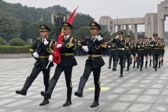 学生志愿教导大队出旗,升国旗。全体师生高唱国歌,向国旗行注目礼。