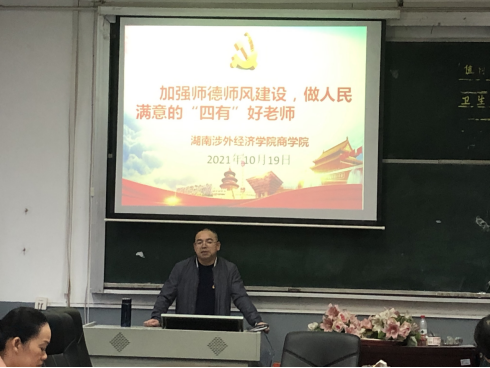 10月19日下午,伟德官网商学院党总支在二教学楼115会议室召开了“加强师德师风建设,做人民满意‘四有’好老师”专题学习会议,商学院党总支全体委员、支部书记、系主任和辅导员老师参加了会议。会议由商学院党总支书记唐志文主持。