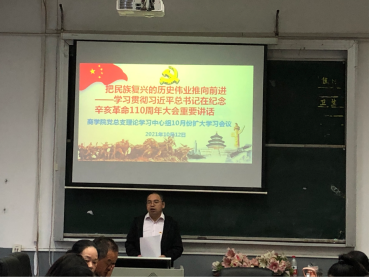 唐志文带领与会同志认真学习了习近平总书记在纪念辛亥革命110周年大会上的重要讲话精神。他从“使命伦”和“规律论”出发,阐述振兴中华是全体中华儿女的共同愿望,大家要牢记使命,遵循历史发展规律;以史为鉴,可以知兴替,他从习近平总书记关于辛亥革命110周年来的“五个历史启示”和新的征程上“五个必须”,强调通过“认识论”和“方法论”的学习,能看清过去为什么我们能成功、弄清未来我们怎样才能继续成功;他就“统一论”和“光明论”,结合习近平总书记的讲话内容,深入浅出地做出了解读:完成祖国统一是中国共产党的历史任务,是实现中华民族伟大复兴的必然要求。