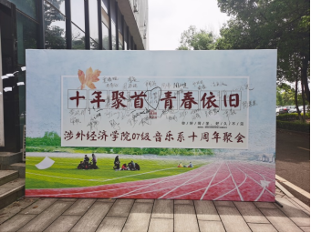 当天上午,组织活动的负责人早早地将签到处设于音乐学院门口等待校友们的到来。前来的每一位同学都穿好了带有学校logo的白色T恤,一一在签名墙上留下姓名,摄影师在照片墙前捕捉到的满是一张张洋溢着幸福的笑脸。