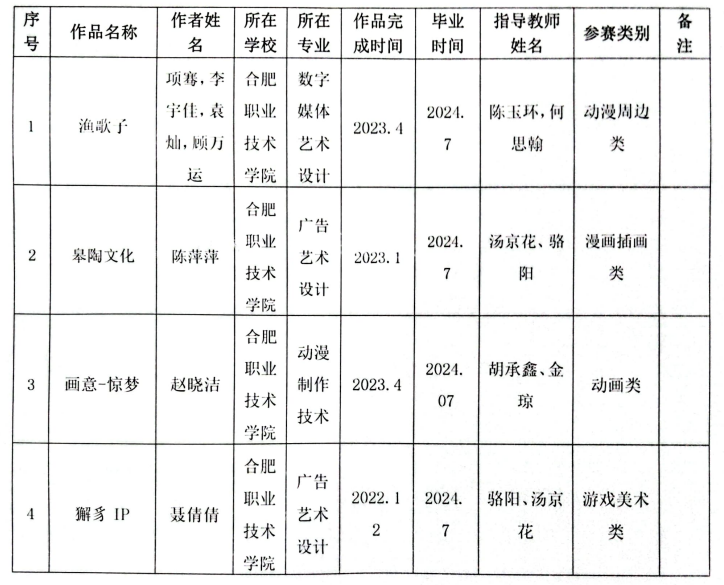 在学院领导高度重视和大力支持下,各专业师生积极响应,截至12月14日,共收到来自各专业的各类作品84件。根据省赛要求,经评委认真评审,遴选出4件优秀作品,代表学校参加2023年安徽省大学生原创动漫大赛。