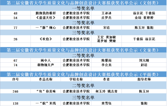 安徽省大学生质量文化与品牌创意大赛由安徽省市场监督管理局、省教育厅,省文化和旅游厅、团省委共同主办,安徽工业大学、安徽大学、安徽师范大学等省内60余所高校本专同赛,共征集11000余件参赛作品,我校广告艺术设计专业组织教师精心指导,严把作品质量关,推选的作品脱颖而出,实现了本项赛事的突破。