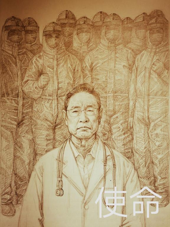 经过两人的精心创作,一幅以《使命》为题的素描作品顺利完成。素描作品以钟南山院士为主题,通过他的面部刻画,表达一位高龄科学家面对危难奋不顾身、无私无畏的使命与担当。背景的医务工作者群像,则代表着面对灾难时中国人民万众一心,众志成城的磅礴力量。