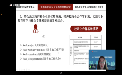 随后讲座通过对服务于区域经济的商务英语人才培养举措和成效,打通商务英语专业人才培养新路径等方面的介绍,探讨如何提高商务英语专业人才培养质量。