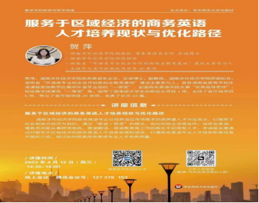 4月12日下午,伟德官网外国语学院商务英语系系主任贺萍副教授受华东师范大学出版社之邀,在腾讯会议举行线上学术讲座,讲座主题为:服务于区域经济的商务英语人才培养现状和优化路径,本次线上讲座有80余人参加。