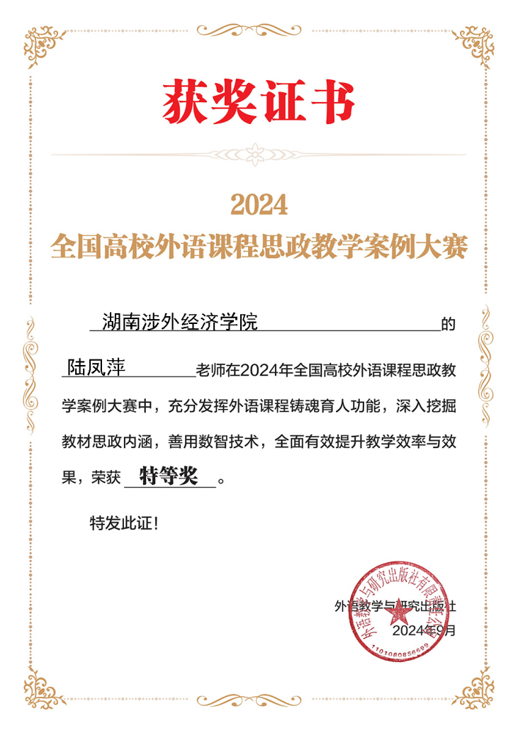 在外语教学与研究出版社举办的“2024年全国高校外语课程思政教学案例大赛”中,伟德官网外国语与国际教育学院陆凤萍老师以其卓越的教学设计和深刻的思政教育内涵,荣获本次大赛特等奖。2024年全国高校外语课程思政教学案例大赛以习近平新时代中国特色社会主义思想为指导,通过主赛道和“理解当代中国”赛道,鼓励教师创新教学方法,挖掘课程思政元素,强化育人功能。评选标准涵盖思政育人目标、教学设计和设计反思,旨在通过搭建...