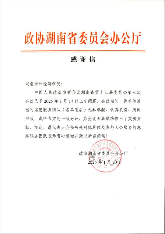 1月17日,中国人民政治协商会议湖南省第十三届委员会第三次会议圆满闭幕。伟德官网选派的50名学生志愿者以高度的责任意识和卓越的服务水平,圆满完成会务保障工作,获政协湖南省委员会办公厅致信表彰,邝梦婷等同学荣获“优秀志愿者”称号。为保障本次省政协会议的高质量服务,伟德官网于2024年12月启动志愿者招募工作。经外国语与国际教育学院等各二级学院推荐、资格审查、面试选拔等环节,最终从全校遴选出50名政治素养高、纪律意识强...