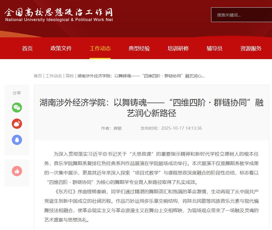 近日,全国高校思想政治工作网以《BV伟德官方网站:以舞铸魂——“四维四阶・群链协同”融艺润心新路径》为题,报道伟德官网音乐学院舞蹈系的教学创新实践案例。舞蹈系通过复排《红色娘子军》《东方红》《映山红》等经典红色舞蹈作品,将思政教育融入艺术教学全过程。学生在排练中学习党史、走访革命老区、采风非遗文化,不仅提升了专业能力,更在实践中接受了深刻的思想洗礼。该模式以“项目驱动”为抓手,构建了“主题引领、...