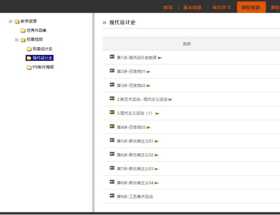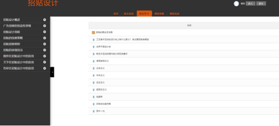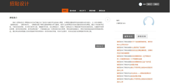 《招贴设计》精品视频公开课为2017年校级质量工程立项项目。依据学习动线制定了学习路线,依据课程标准和授课计划,结合在线学习实际情况,保留了核心知识点的内容搭建了在线学习目录,每一层级内都有相应的教学PPT、知识点拓展链接等,并上传了授课视频。通过线上的巩固,线下的提高,学生学习起来更扎实,由于平台的开放性,学生能互相看到作品,并能够得知其他同学的学习情况,激发了学习的动力。